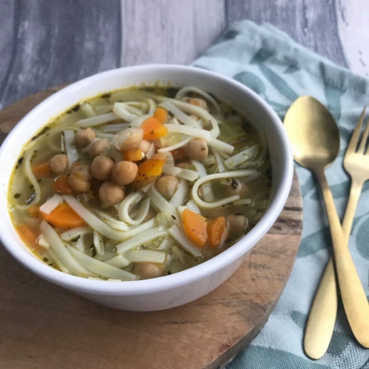Deze soep is snel klaar, een vega variant op de kippensoep, laag in calorieën, maar toch vullend door de noedels en de kikkererwten. Ideaal voor een koude druilerige dag of als je een opkikkertje nodig hebt. De gember heeft een verwarmend effect en kalmeert de maag.