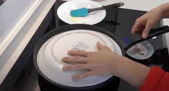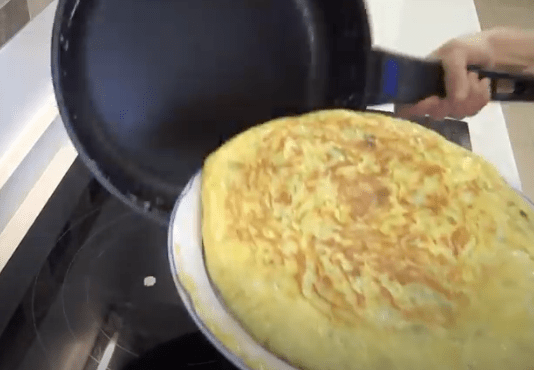 Je neemt een bord groter dan je pan en legt deze plat op je pan. Druk goed aan en draai je pan op het bord. Laat dan de tortilla terug in je pan glijden. (zie foto’s).