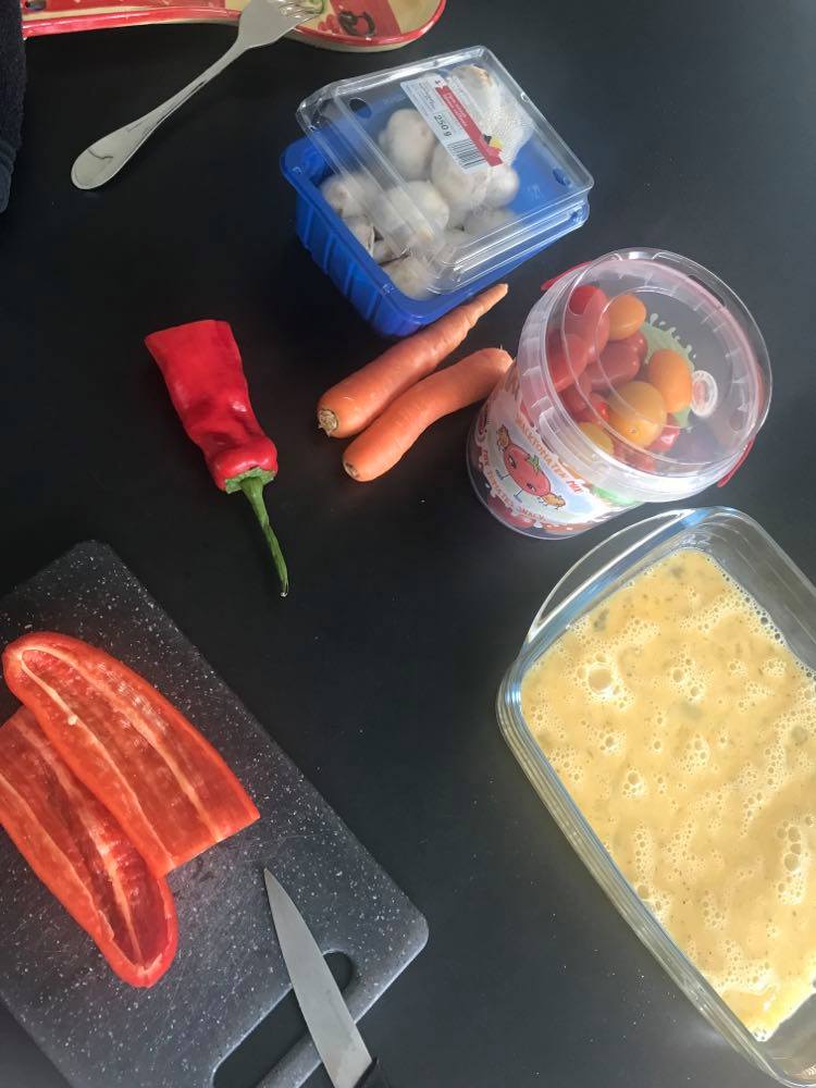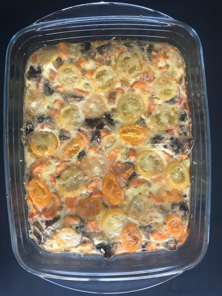 Vet een ovenschaal in met olijfolie. Doe de 4 eieren erin en kluts ze door elkaar. Voeg de melk toe en meng goed. Strooi de groenten over het eimengsel. De groenten zakken vanzelf door het gewicht.