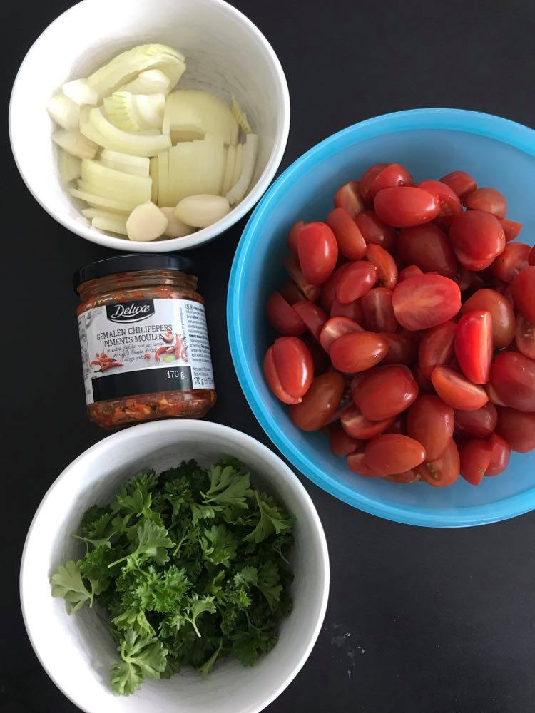 Snijd de ui in halve ringen, pers de look, snijd de chilipeper fijn. Snijd je tomaten in stukken. Ik heb kerstomaten gebruikt (ik vind deze lekkerder van smaak) en heb ze gehalveerd. Snijd je verse peterselie fijn of gebruik peterselie uit de diepvries.