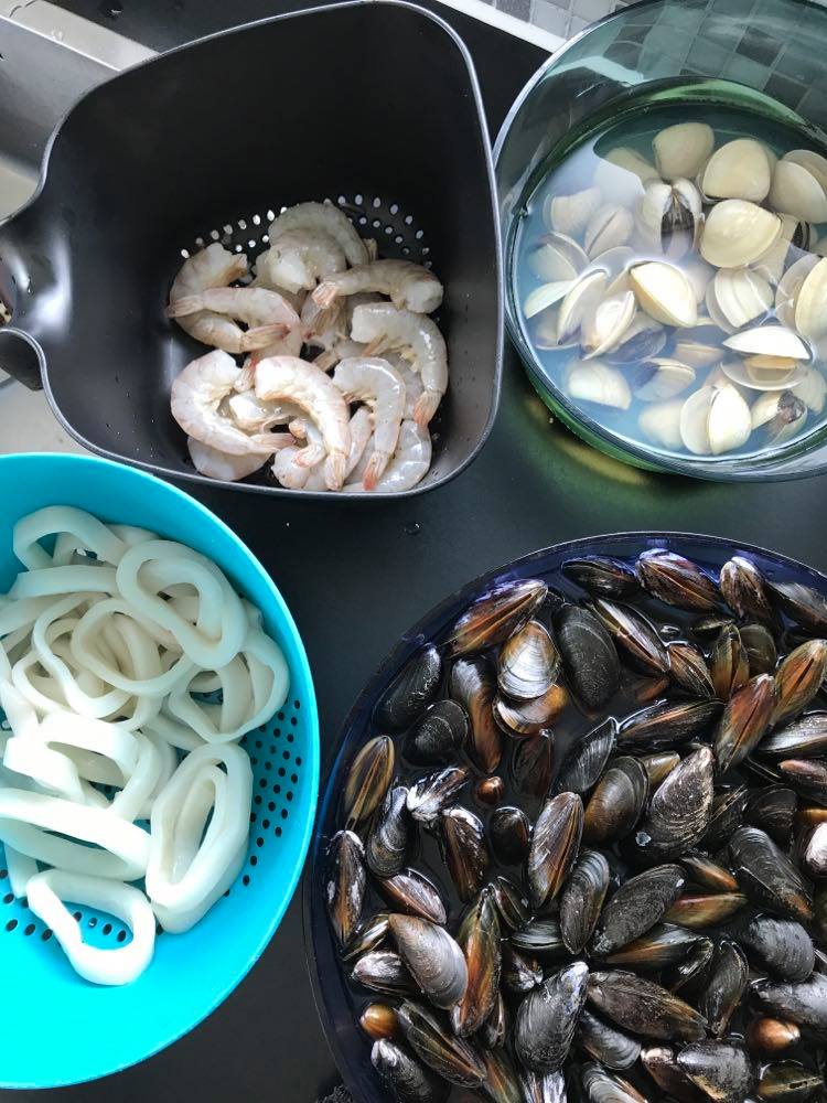 Week de mosselen en vongole 1 uur in koud water. Lek uit en laat staan. Heb je diepvries inktvisringen en scampi, laat deze helemaal ontdooien uitlekken.