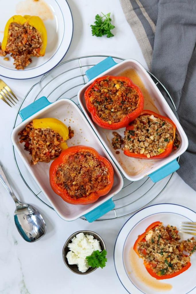 Vul je paprika’s met het mengsel, bestrooi met paneermeel en bak 40 minuten in de oven tot ze gaar zijn.