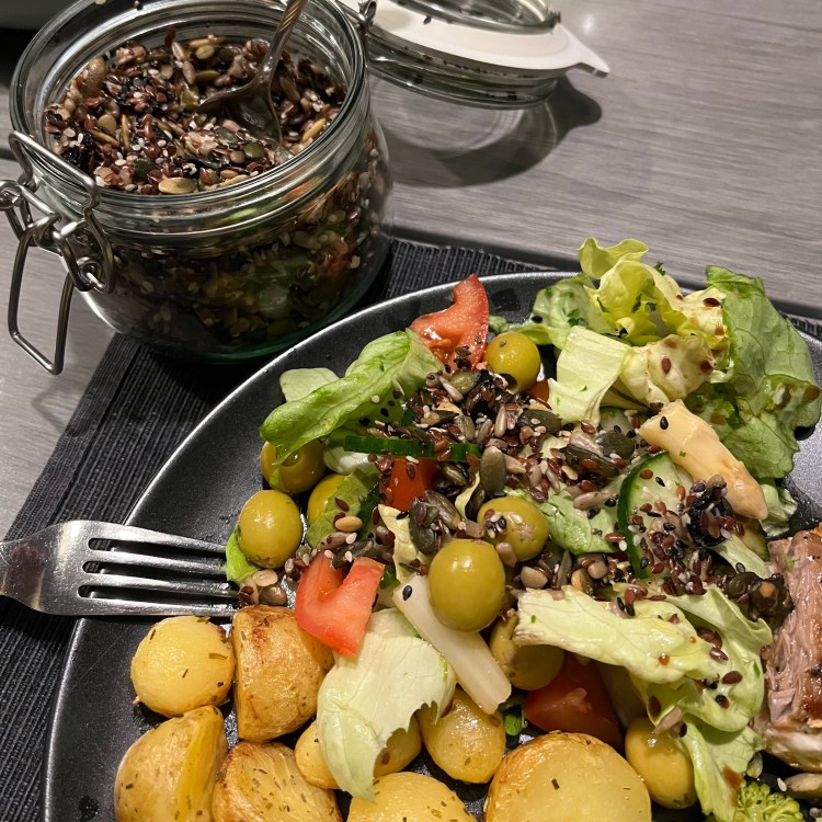 Maar deze granola eet je niet in je yoghurt, maar doe je over je salade. Het geeft je salade iets krokant, een extra smaakje door de kruiden en het is ook heel