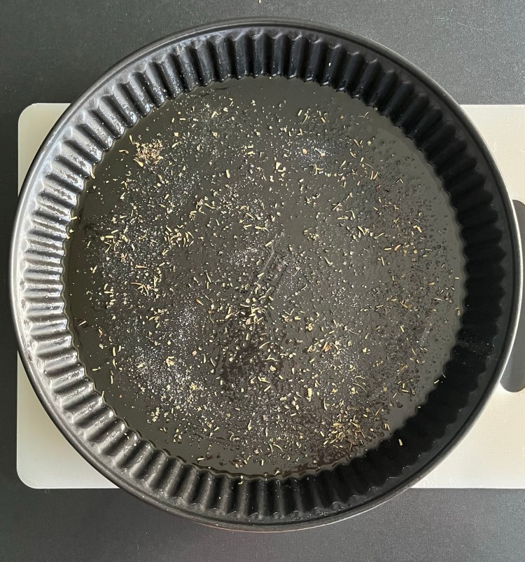 Neem een taartvorm van ongeveer 20 cm diameter. Vet de taartvorm in met olijfolie. Kruid de hele bodem met zwarte peper, zout en Provençaalse kruiden.