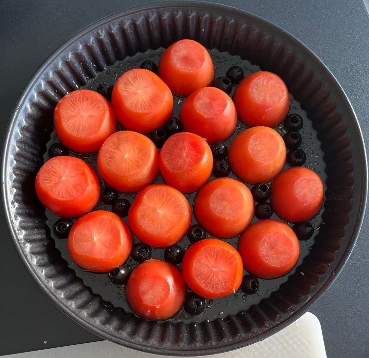 Was de tomaten en halveer ze. Ik heb van alle tomaten ook de ‘kontjes’ ervan af gesneden. Leg de tomaten met de grote gesneden kant plat op de taartbodem. De bodem moet niet helemaal vol zijn.